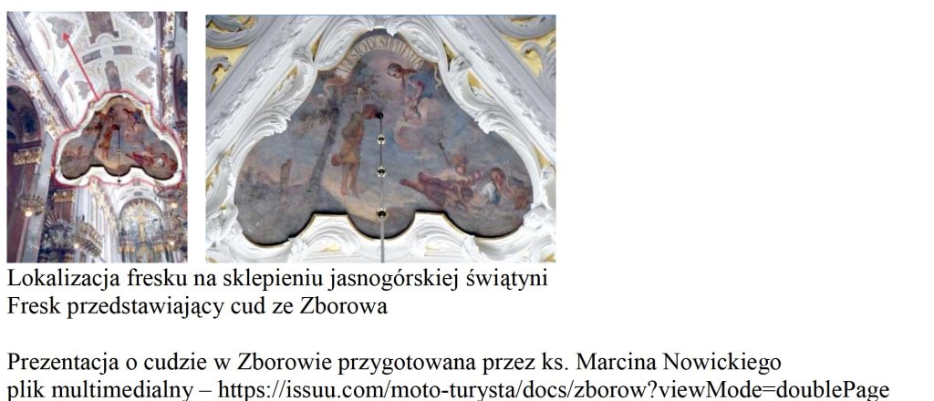 W 1564 r. w Zborowie mali chłopcy podczas zabawy w sąd powiesili swojego kolegę – Walentego Żeromskiego, syna zarządcy miejscowego majątku, na drzewie. Zrozpaczeni jego rodzice zwrócili się do Matki Bożej, aby za jej wstawiennictwem Bóg przywrócił mu życie i przyrzekli udać się w pielgrzymce do Najświętszej Maryi Panny w jasnogórskim klasztorze, aby złożyć Jej tam pokorne dziękczynienie za wyjednanie u Boga cudu przywrócenia dziecku życia. Tak też się stało, a wiadomość o tym wydarzeniu zapisana została w księdze cudów otrzymanych za przyczyną Matki Boskiej Częstochowskiej i przedstawiono je na jednym z fresków umieszczonych na sklepieniu jasnogórskiej świątyni.
