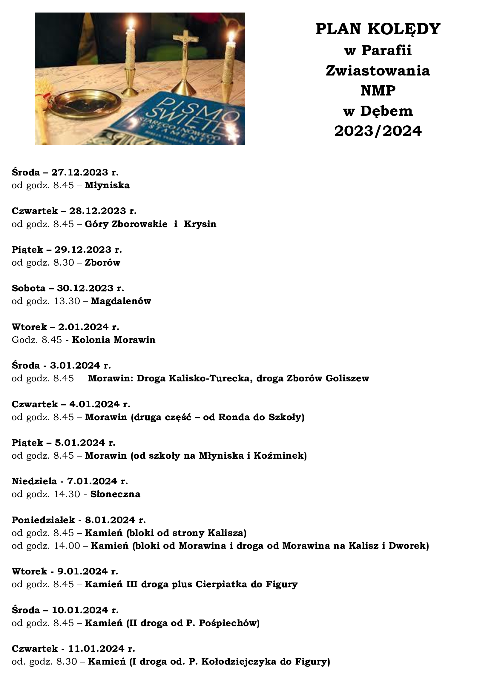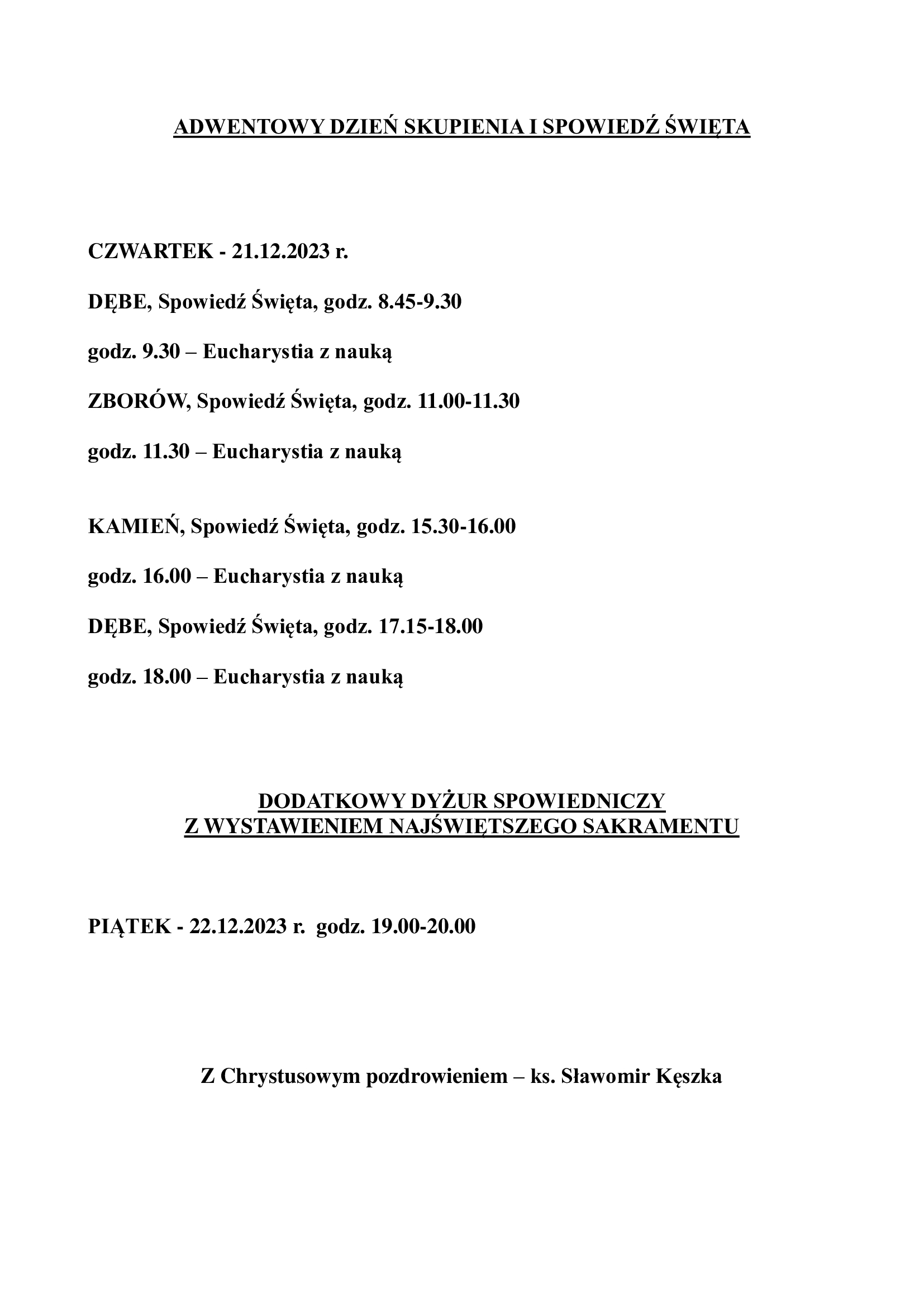 18.00 Dębe – Msza Św. (nabożeństo przebłagalne). Po Eucharystii Nowenna do Matki Bożej Dębskiej.