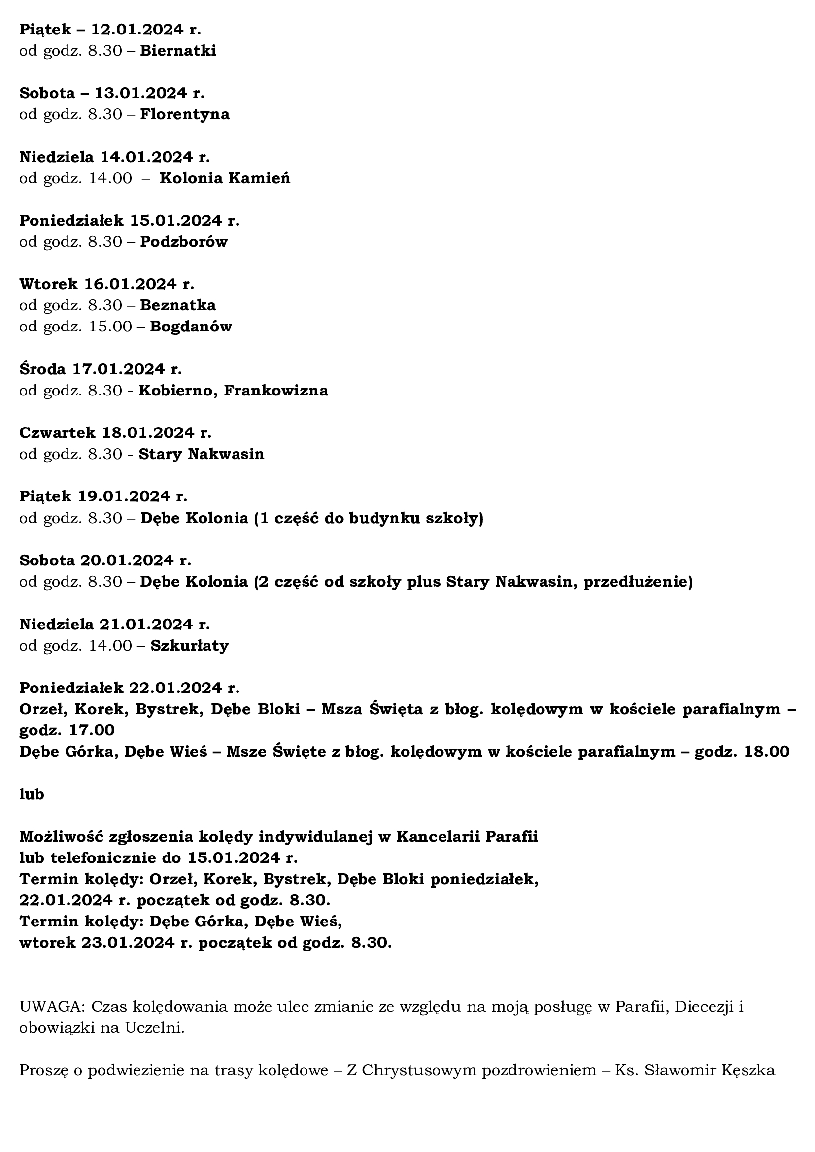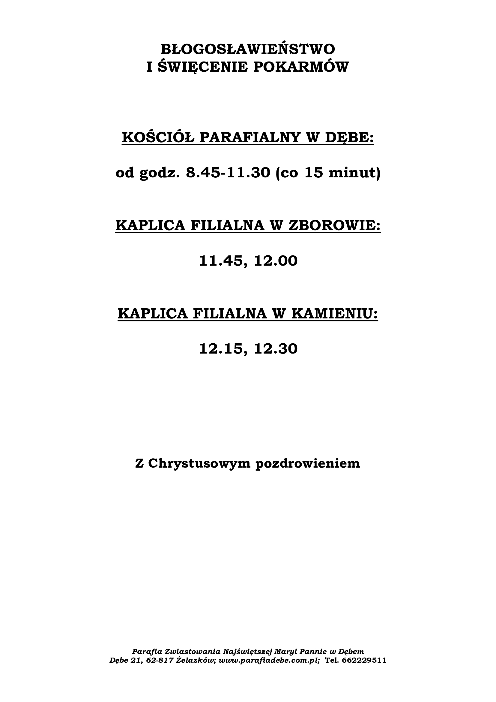 9.30 Dębe – (z udzieleniem sakramentu chorych), po Mszy Św. błogosławieństwo lourdzkie