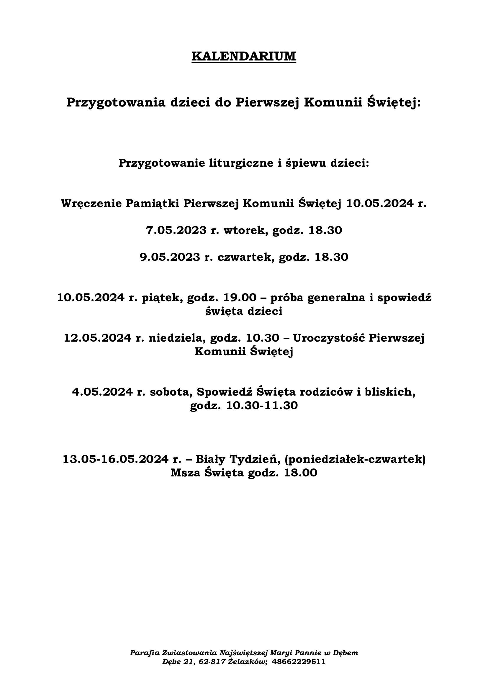 12.00 Dębe – Msza Św. – Suma. Rocznica I Komunii Świętej.